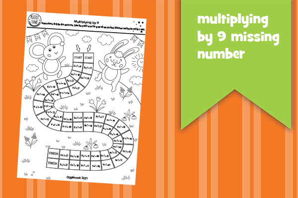 Multiplying by 9 b&w balloons, rabbit race, color