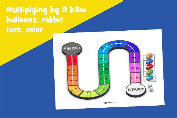 Multiplying by 8 b&w balloons, rabbit race, color