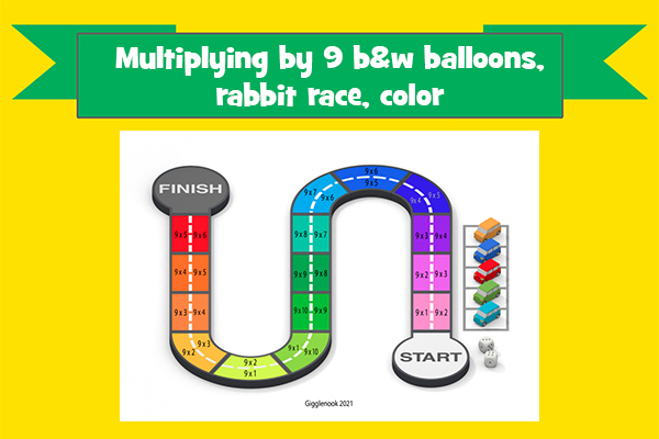 Multiplying by 9 b&w balloons, rabbit race, color