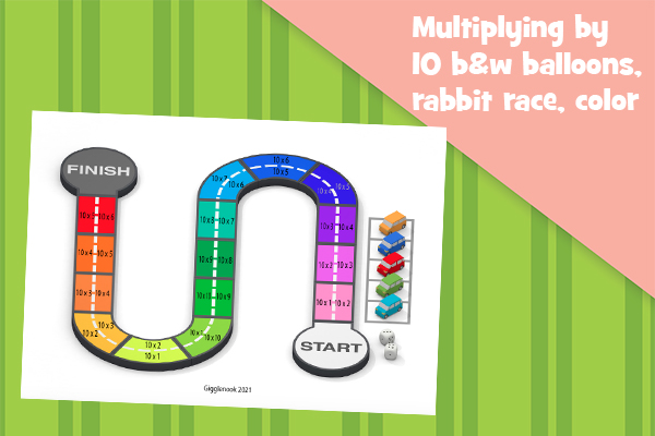 Multiplying by 10 b&w balloons, rabbit race, color